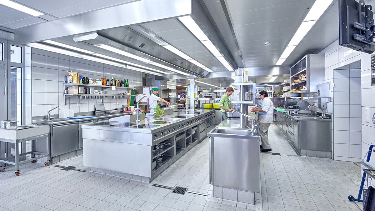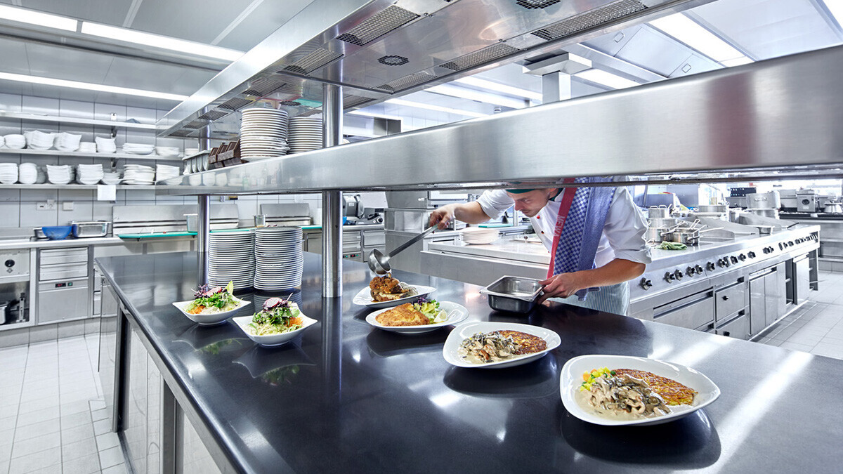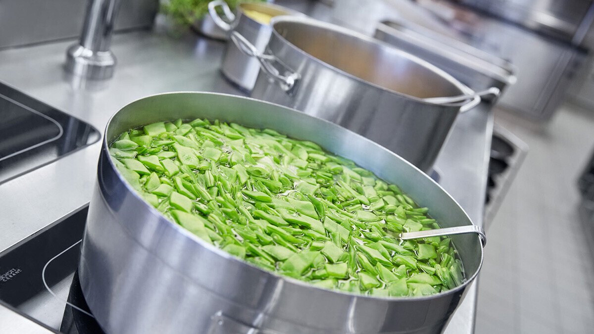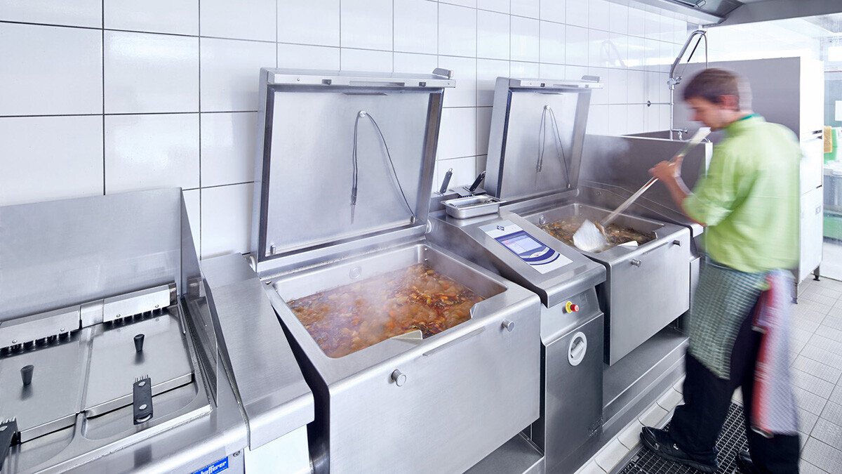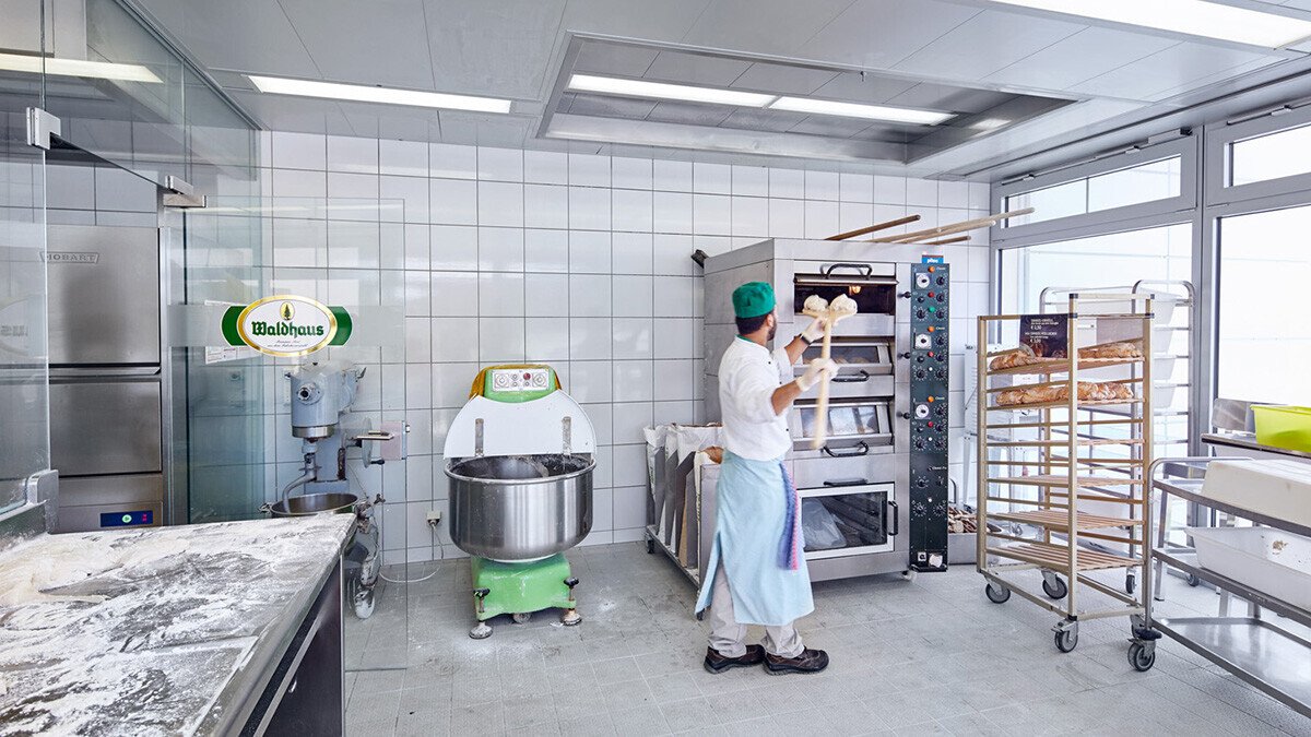 Die Vielfalt der selbst hergestellten Produkte und das schiere Volumen stellen höchste Anforderungen an die Planung der Arbeitsprozesse, die Auswahl und Auslegung der Kochtechnik und die Gestaltung des Geräteparks. Durch eine klare Unterteilung der Bereiche und den Einsatz leistungsfähiger Kochtechnik wurde die neue Küche trotzhöherer Kapazität deutlich geräumiger. Großzügige, hochwertige Arbeitsflächen dominieren das Bild und zeigen, dass sich die Waldhaus-Philosophie von Qualität, Motivation und Nachhaltigkeit auch in den Arbeitsplätzen der Mitarbeiter zeigt.