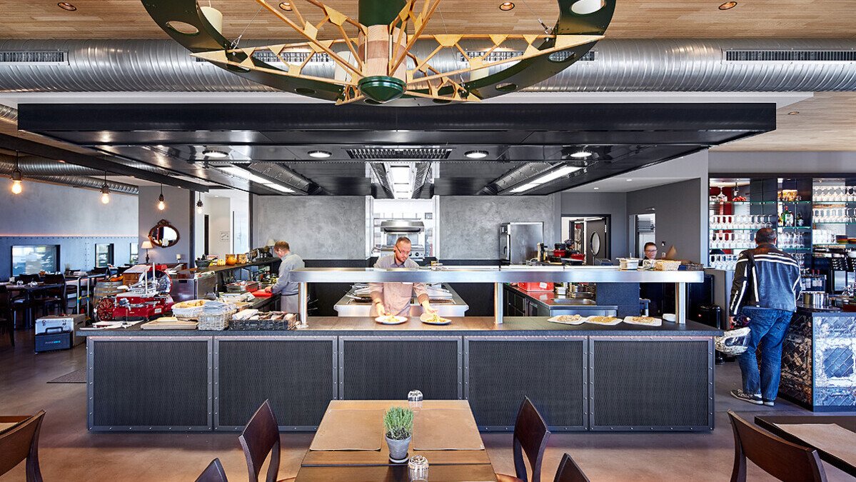 Direkt am Flughafen im Gewerbepark Eschbach, zwischen Schwarzwald und Vogesen, liegt der Fliegerhorst. Das ausgefeilte Gastronomiekonzept mit Restaurant und Bar setzt auf Qualität und Erlebnis. Ausgestattet mit erlesenen Materialien und vielen der Luftfahrt entlehnten Details, einer offenen Küche und einer hochwertigen Karte wird der Gast zu einem genussvollen und kurzweiligen Ausflug in die Welt der Flieger eingeladen. Küche und Theke wurden gemeinsam geplant und bilden eine harmonische Einheit. Auch die Lüftungsdecke, die den gesamten Küchenbereich überspannt, fällt sofort ins Auge.
