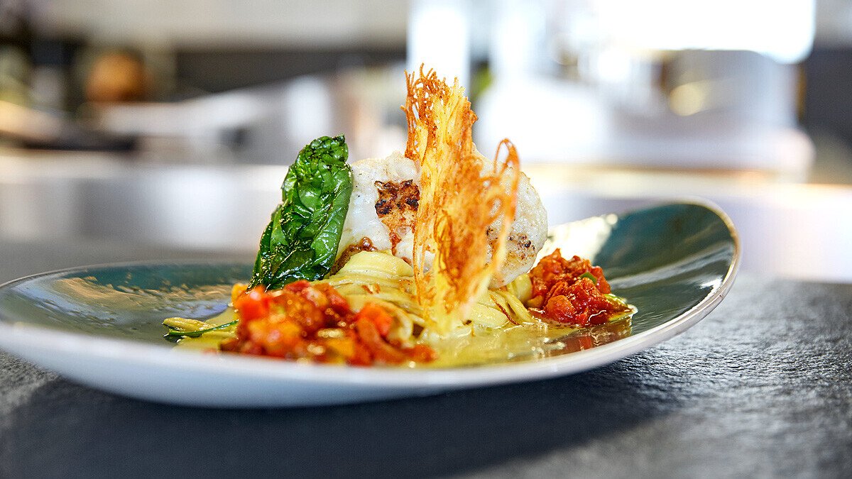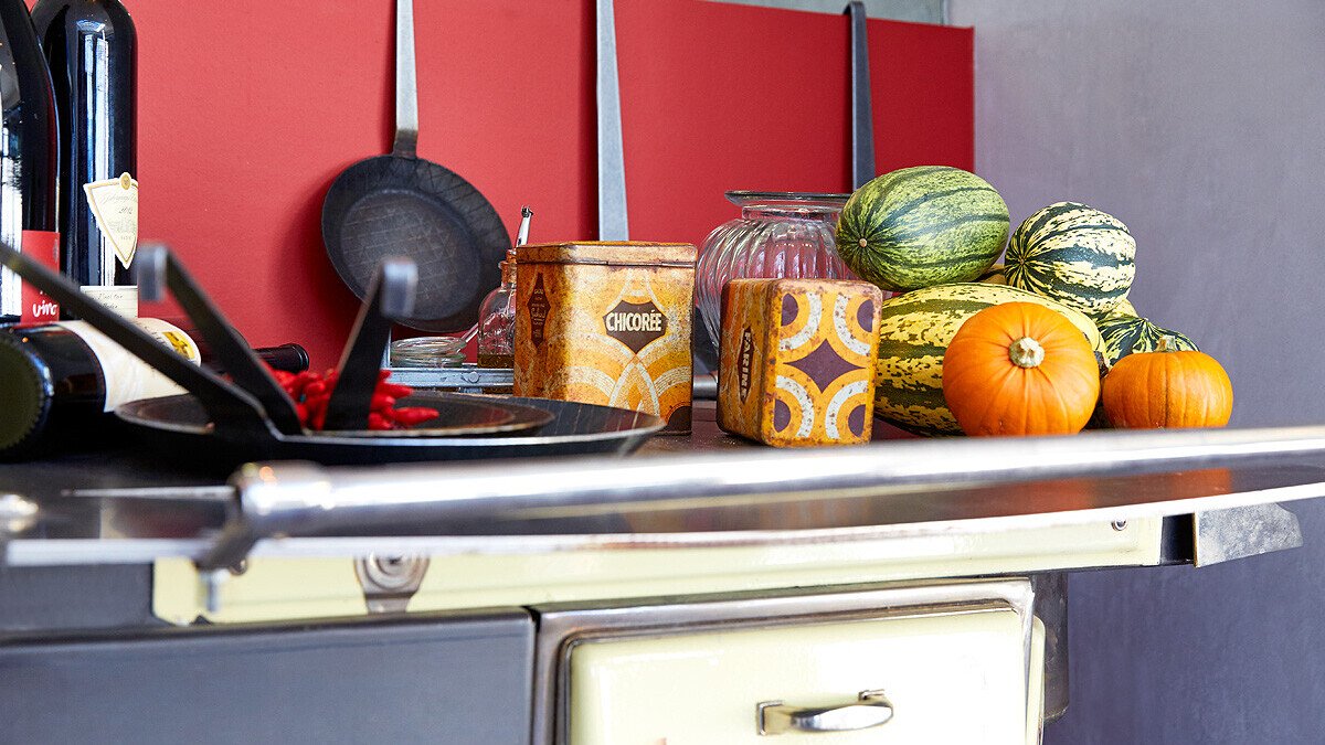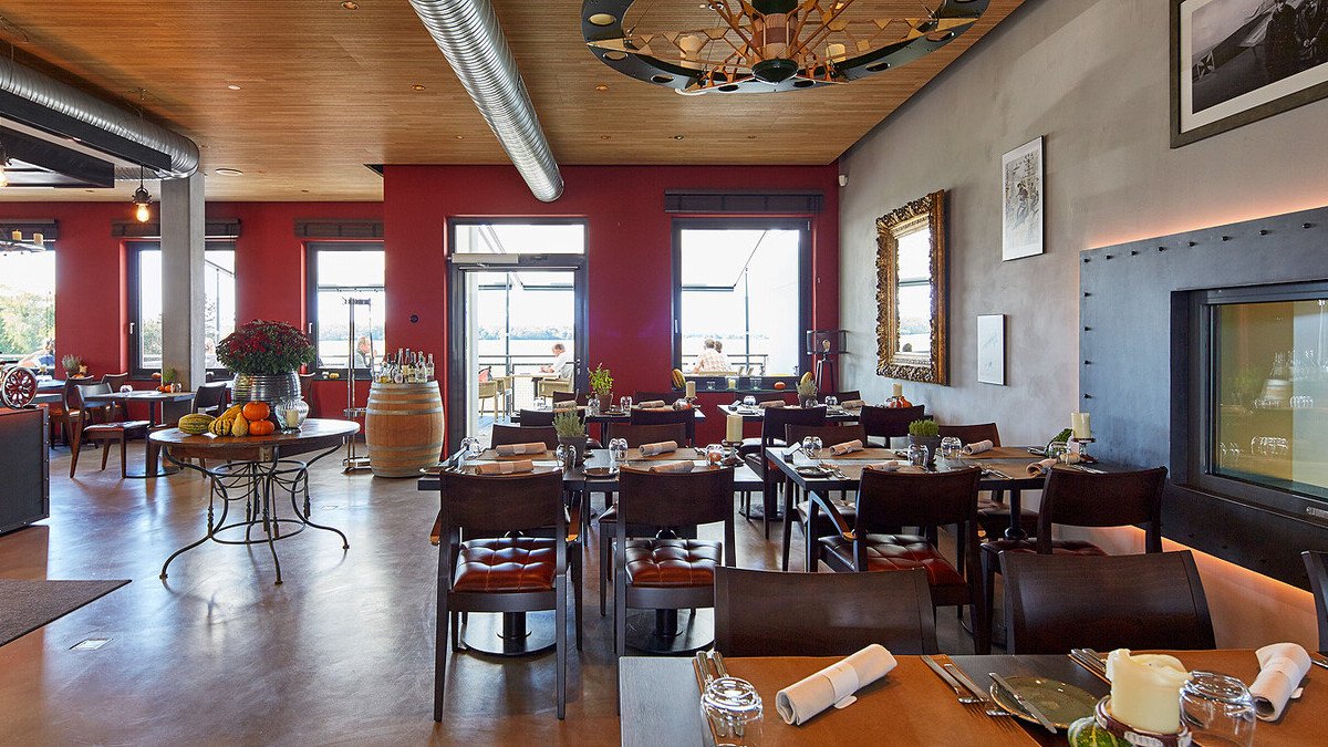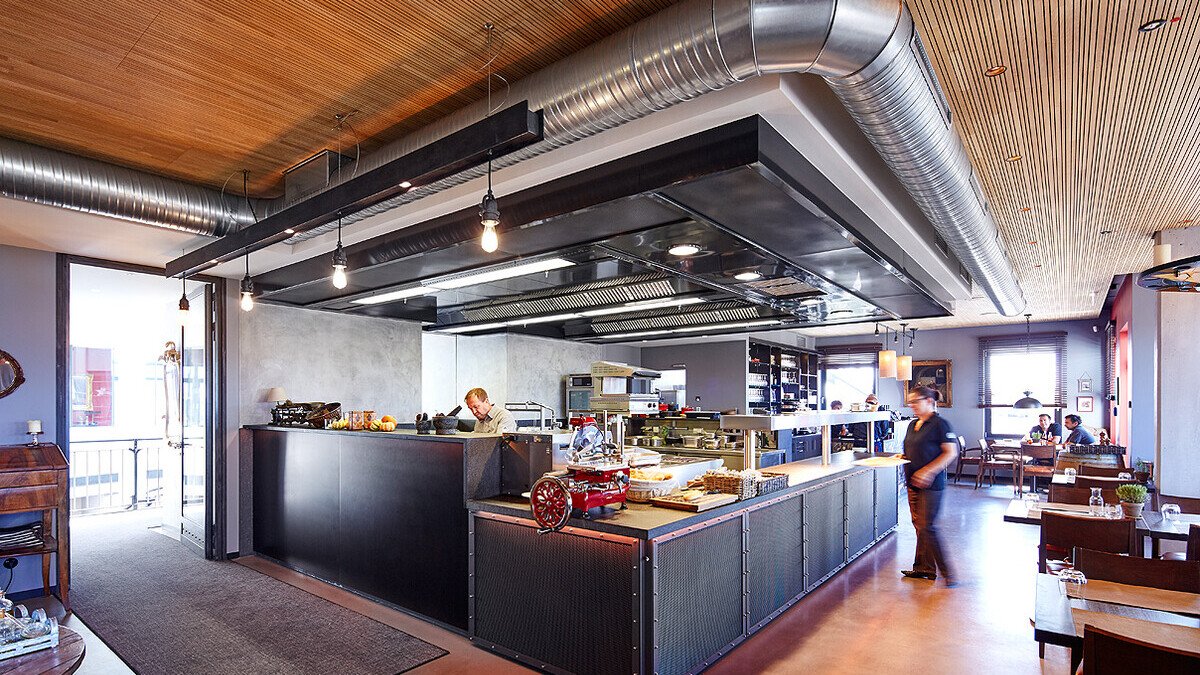 Die schwarz lackierte Sonderanfertigung ist eine gelungene Mischung aus Technik und Design. Sie sorgt in der Küche für angenehmes Klima. Das Gesamtkonzept ist stimmig: Während die Gäste auf den nächsten Gang warten, können Sie einen Blick in den benachbarten Hangar werfen. Dort befindet sich eine eindrucksvolle Sammlung historischer, vollständig funktionstüchtiger Flugzeuge und Autos. Auch ein Ausflug auf die große Terrasse, die 40 zusätzliche Plätze bietet, lohnt: Hier kann man kleine Flugzeuge beim Starten und Landen bewundern und die herrliche Aussicht auf die Vogesen genießen.
