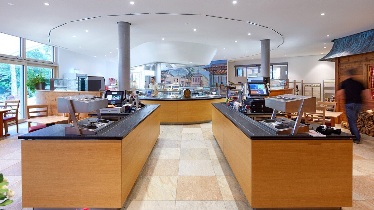 Die Ausgabe wurde als Ellipse konzipiert. Dadurch entsteht ein besonders langer Thekenbereich, der vielen Gästen die Möglichkeit bietet, sich gleichzeitig zu bedienen – mit einer entsprechenden Erhöhung der Ausgabe-Kapazität.