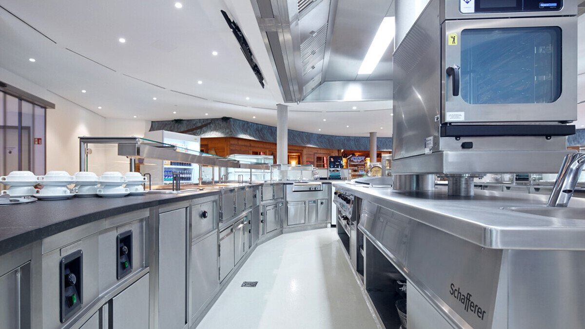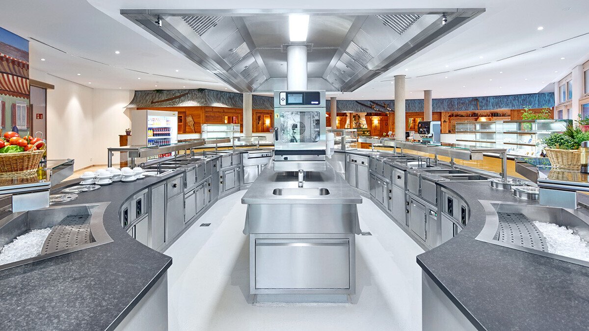 Auch innerhalb des Kochbereichs herrschen optimale Raumausnutzung und Ergonomie: Da der Combidämpfer 270° drehbar ist, kann er sowohl von Saucier als auch von Entremetier genutzt werden. In den gekühlten Unterbauten ist der Tagesbedarf griffbereit bevorratet.