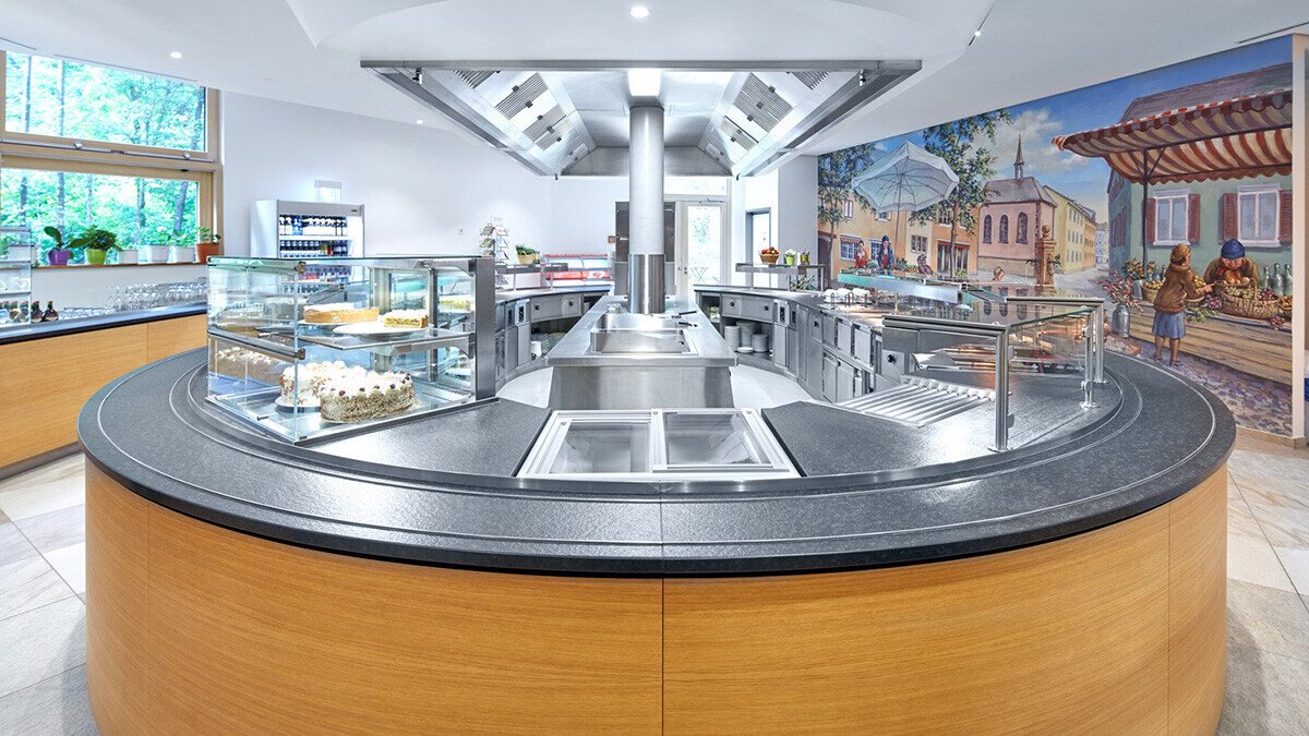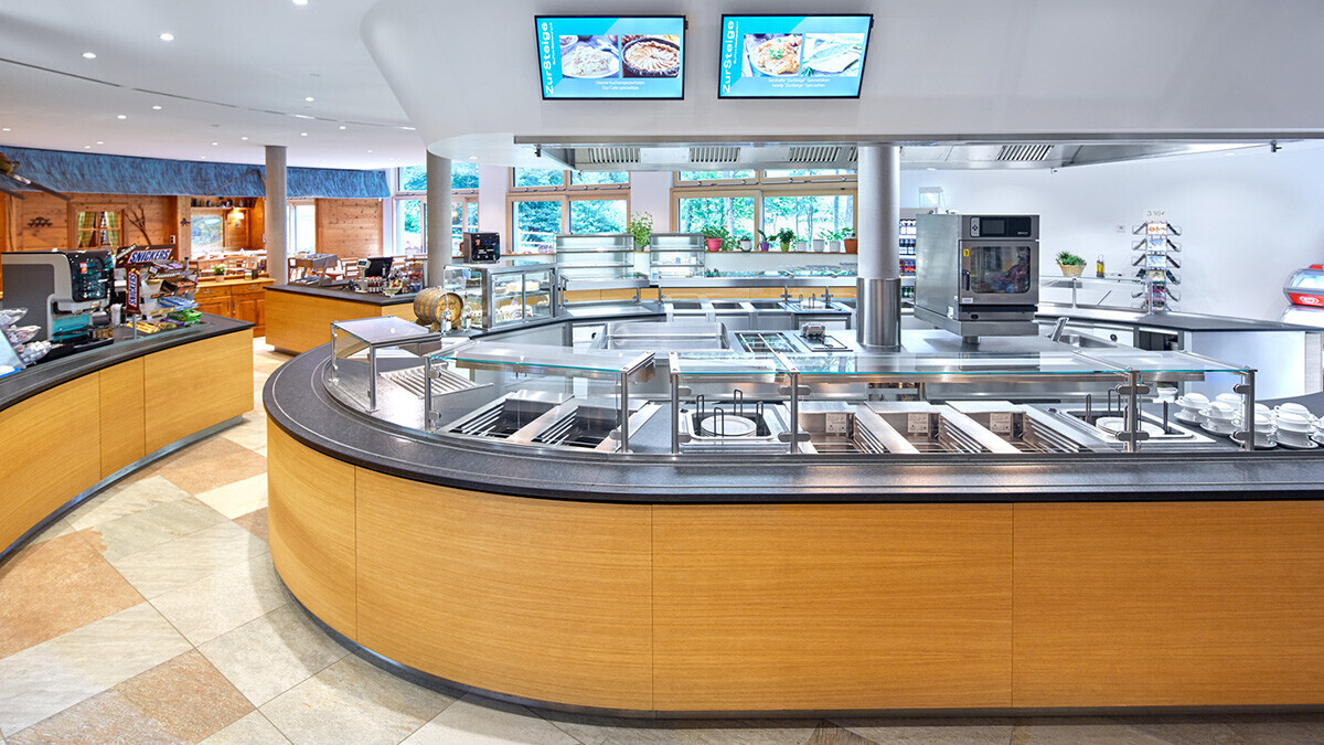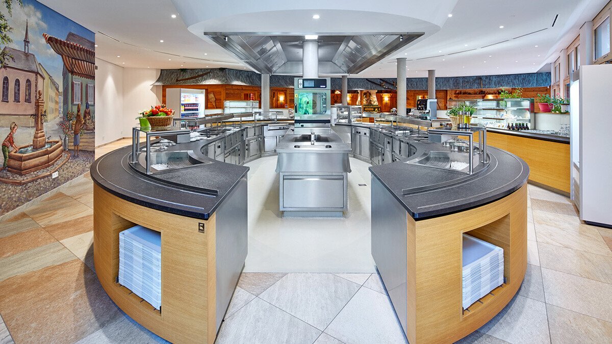 Im zentralen Frontcooking-Bereich werden die vorbereiteten Speisen direkt im Gastraum regeneriert und die À la minute- Wünsche der Gäste erfüllt, was die Frische des Angebots für die Gäste greifbar macht.