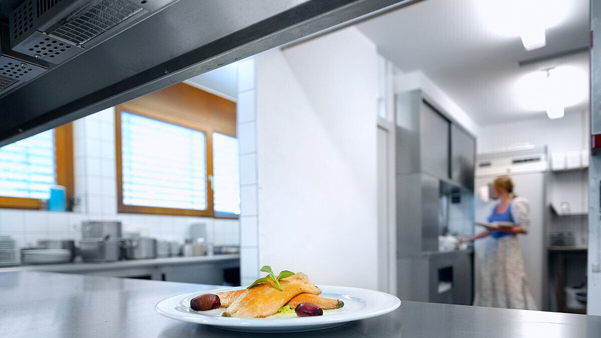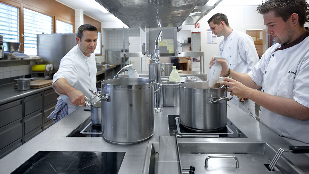 Die Küche auch mit nur zwei Köchen effizient bewirtschaften zu können, war ein wichtiges Ziel des Küchenumbaus. Durch den Einsatz von Induktionstechnik wurden die Abläufe vereinfacht und beschleunigt. Auf einer geringeren Fläche konnte so nicht nur die gleiche Kapazität erzielt, sondern gleichzeitig die Arbeitsfläche vergrößert und die Abläufe verbessert werden. Das Hygiene-Konzept mit einer Ausführung nach Hygienestandard H2 ermöglicht weitere Einsparungen an Arbeitszeit und Chemikalien. Geringere Energiekosten senken die Betriebskosten zusätzlich.